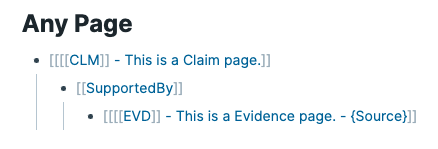 Indent a block underneath the claim block. And reference the page [[SupportedBy]]. We'll call this the connecting block.
